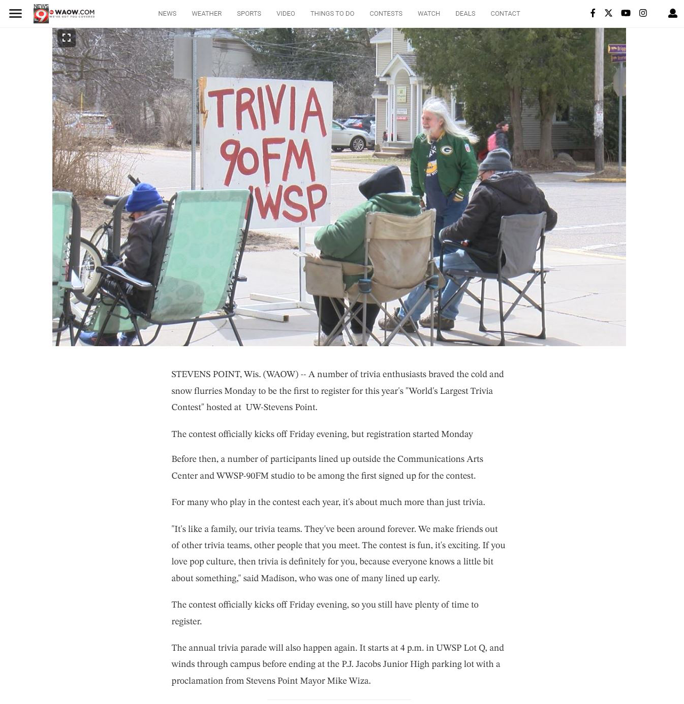 WAOW Newline 9 - April 17, 2021 - "UWSP hosts worlds largest trivia contest" (Article)