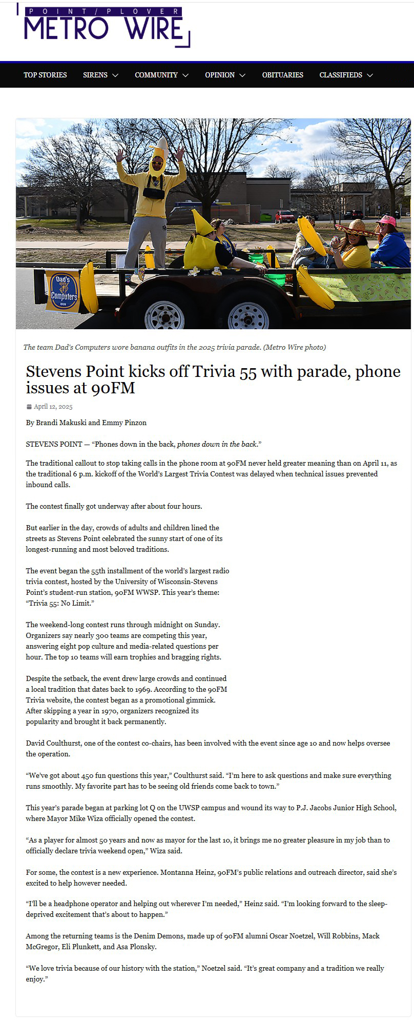 Point/Plover Metrowire - April 12, 2025 - "Stevens Point Kicks off Trivia 55 with Parade, Phone Issues at 90FM"