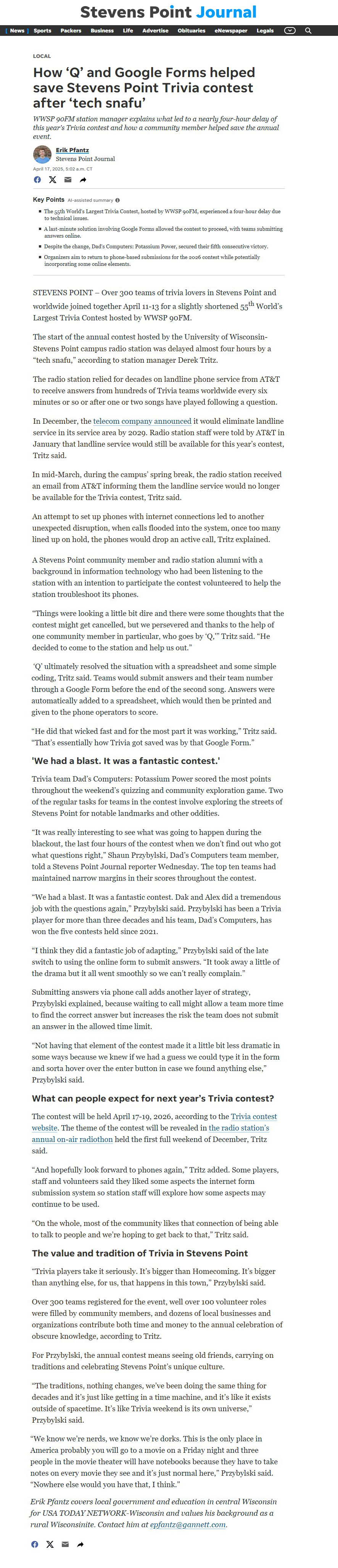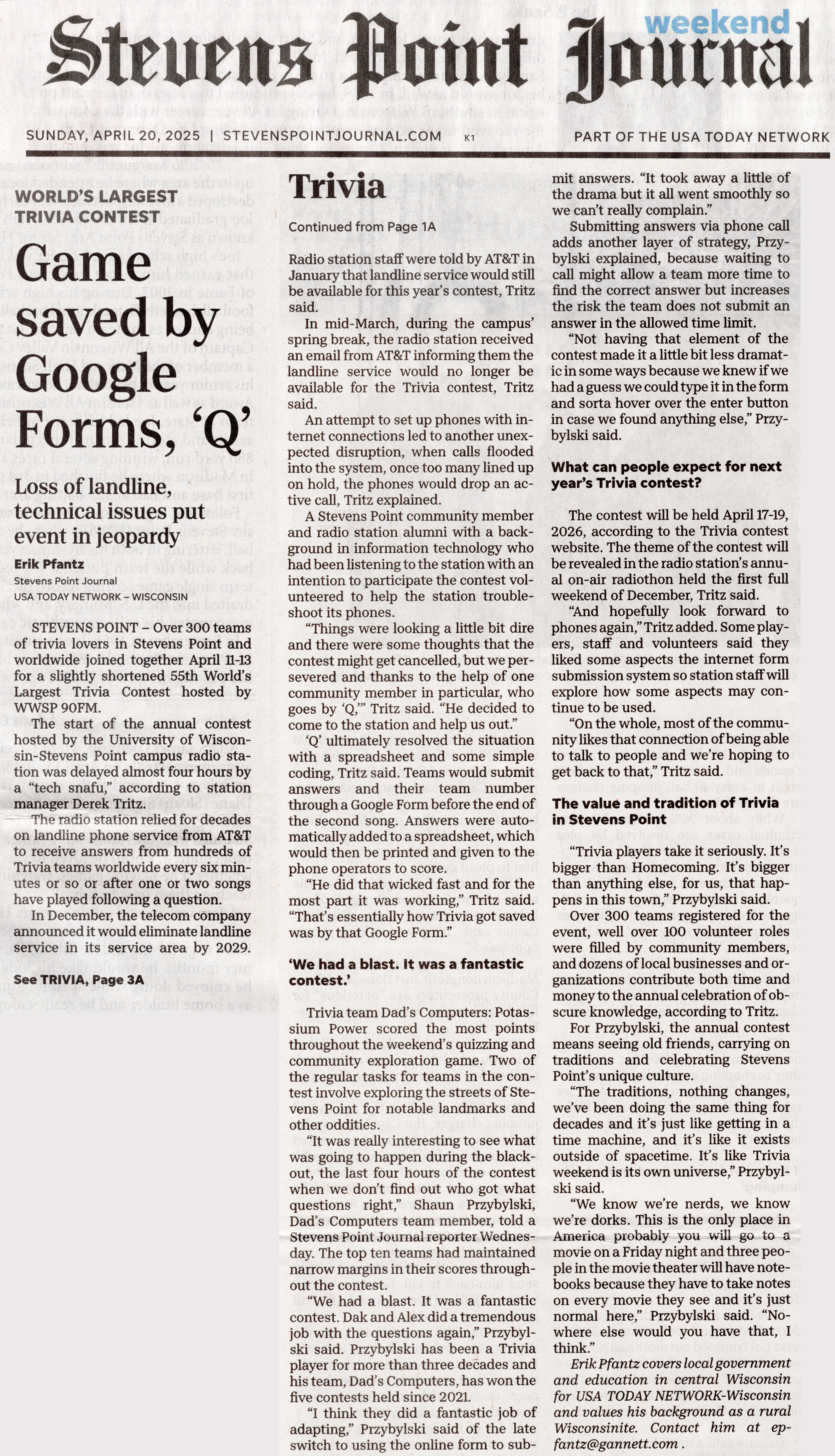 Stevens Point Journal - How Q and Google Forms Helped Save Stevens Point Trivia Contest After Tech Snafu - April 17, 2025 (Online Edition)