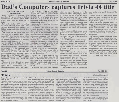 Portage County Gazette - April 26, 2013 - Dad's Computers Captures Trivia 44 Title |