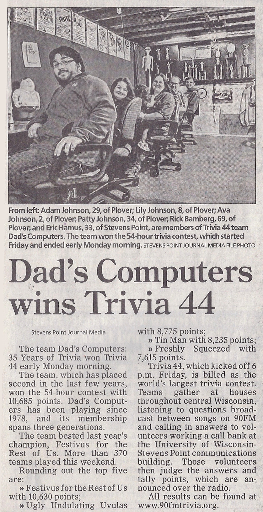 Stevens Point Journal - April 15, 2014 - "With Back to Back Wins Dad's Computers Feels Heat of Trivia Success"