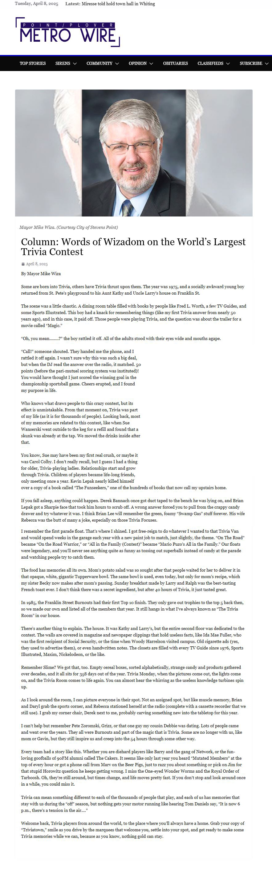 Metrowire - April 8, 2025 - "Words of Wizadom on the World’s Largest Trivia Contest"