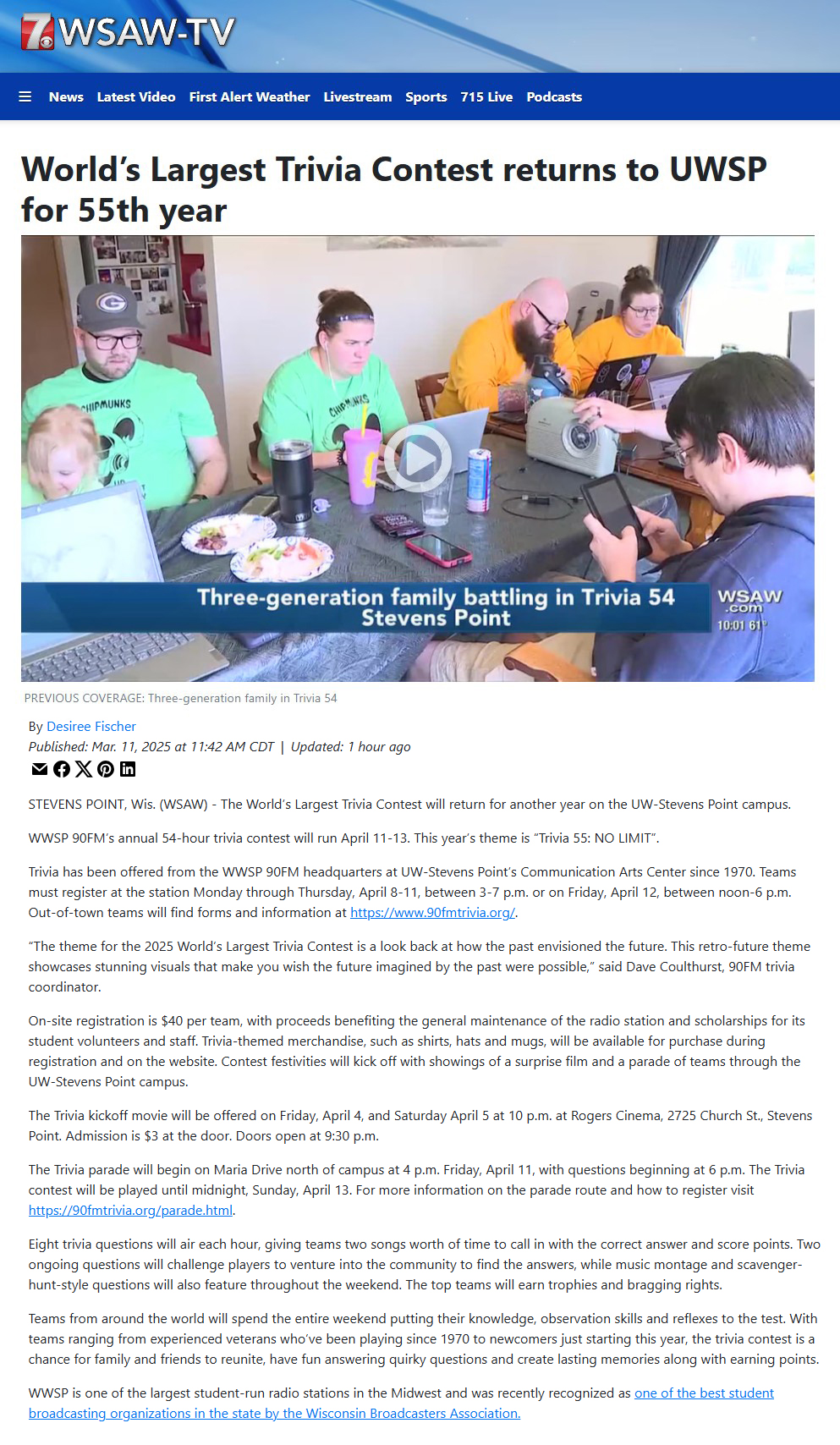 WSAW - March 11, 2025 - "World’s Largest Trivia Contest returns to UWSP for 55th year"