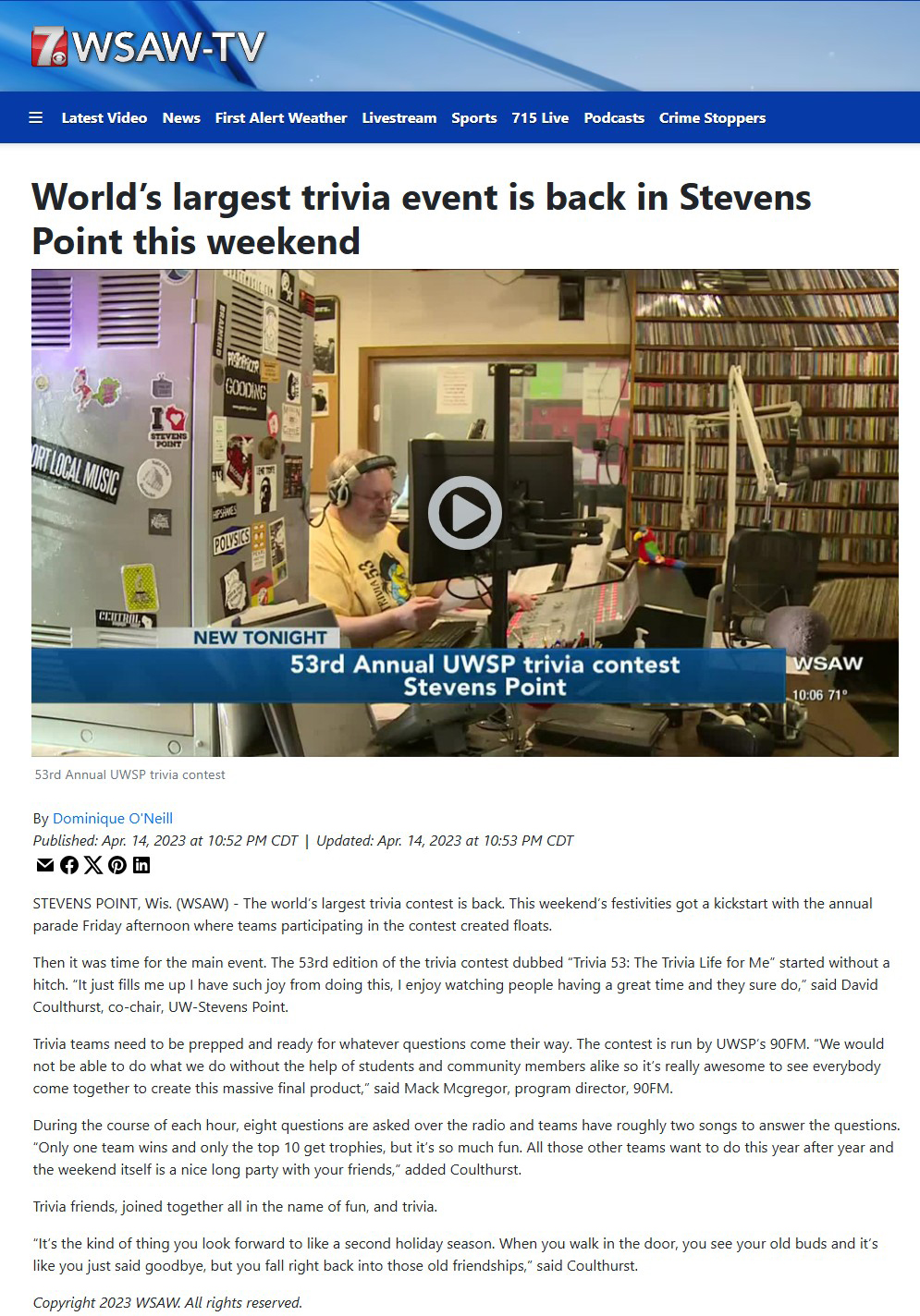 WSAW - April 11, 2025 - "Despite Technical Issues UWSP Trivia Contest Is Still Going Strong After 55 Years