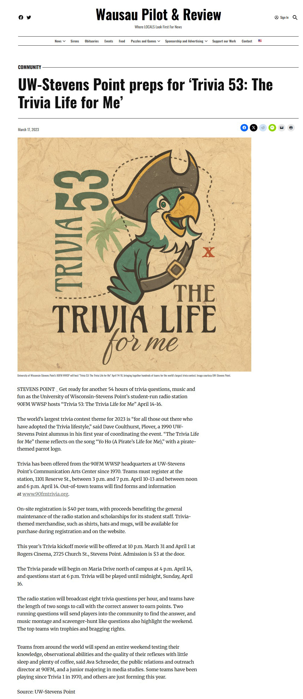 Wausau Pilot - March 17, 2023 - "UWSP Preps Trivia 53 The Trivia Life for Me"